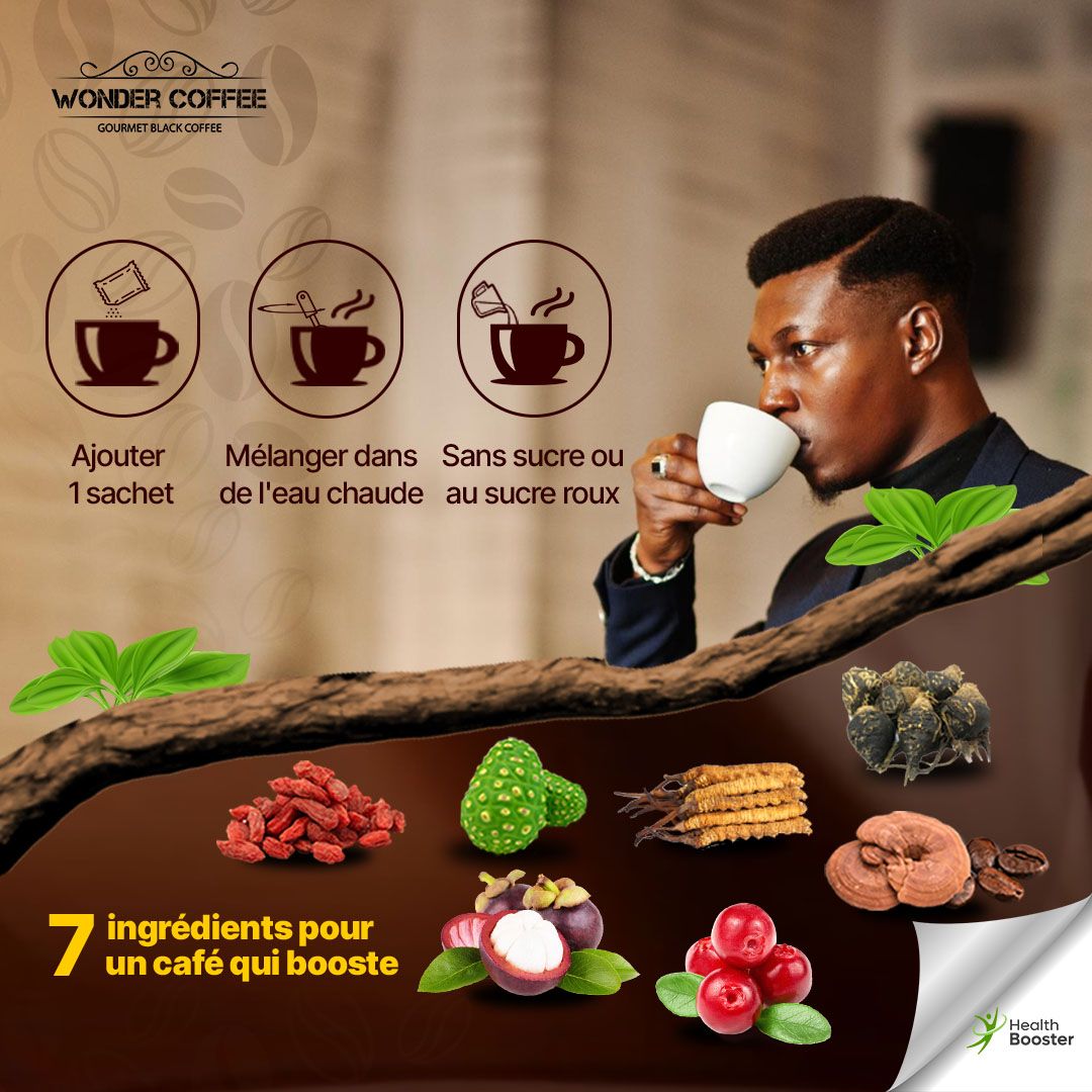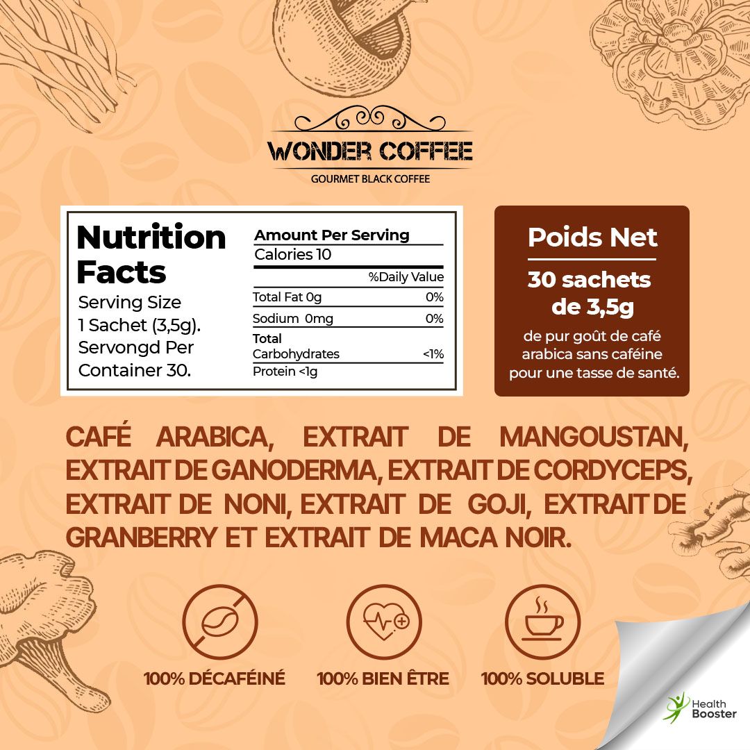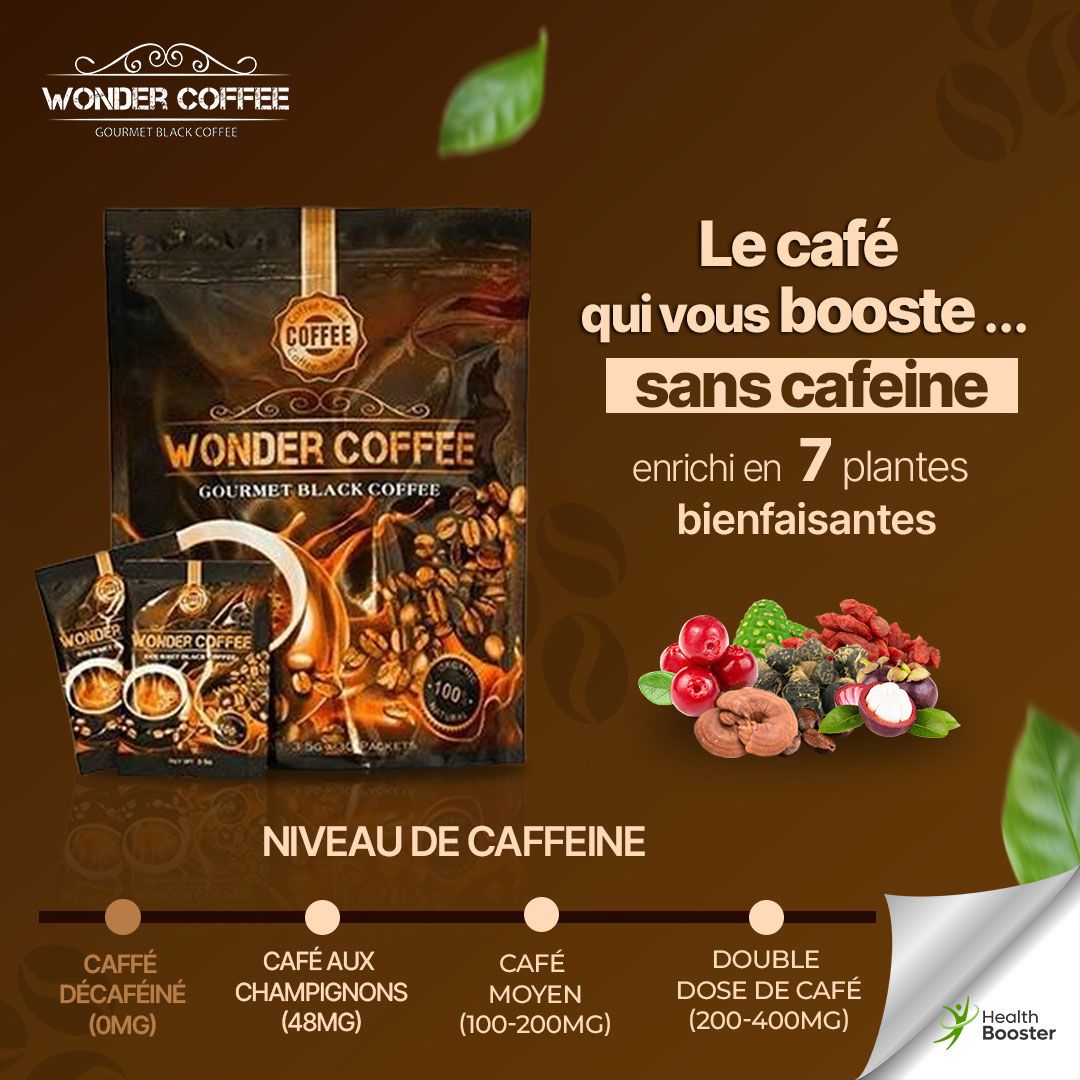 Wonder Coffee est un produit 100 % décaféiné, et 100% naturel, qui protège le cœur, renforce l’immunité et améliore l’énergie physique, morale et sexuelle, et le tout,  sans contraintes postérieures.