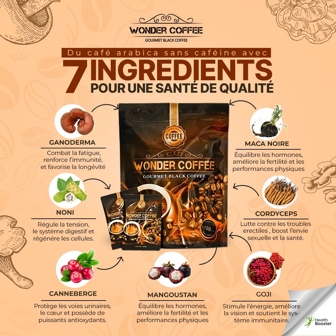 Wonder Coffee - Le Café Arabica sans caféine, enrichi des 7 super plantes, offrant une expérience gustative inégalée et une irrésistible douceur de chaque gorgée.